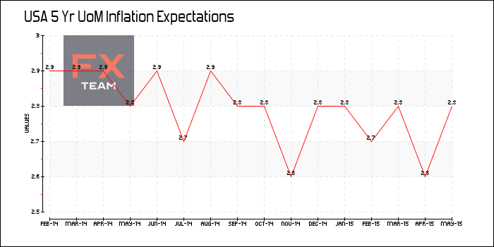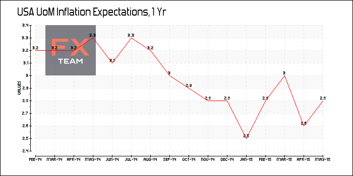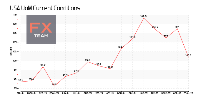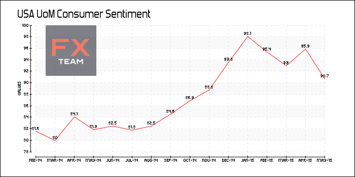По предварительной оценке, индикатор уверенности потребителей от университета Мичигана (PreliminaryUoMConsumerSentiment) составил 88,6 пункта за май 2015 г. по сравнению с 95,9 пункта в апреле. Прогнозировалось незначительное снижение показателя до 95,8 пункта.