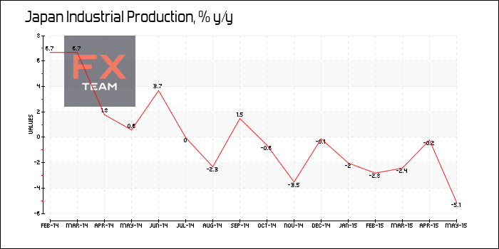 По предварительным данным, объем промышленного производства Японии сократился на 2,2% за май 2015 г. в месячном исчислении, сообщает Министерство экономики, торговли и промышленности. В предыдущем месяце индекс вырос на 1,2%. Экономисты прогнозировали снижение показателя на 0,8% в мае.
