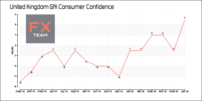 Индикатор потребительской уверенности Великобритании, рассчитываемый Gfk, составил 7 пунктов за июнь 2015 г. по сравнению с 1 пунктом в предыдущем месяце. Прогнозировалось повышение показателя до 2 пунктов.