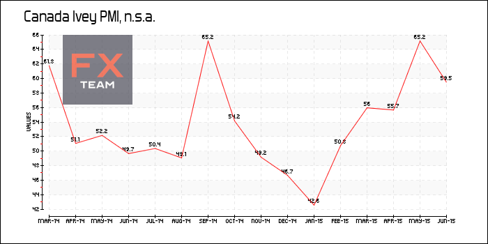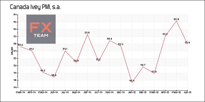 Индекс PMI от Ivey (IveyPurchasingManagersIndex) c поправкой на сезонность составил 55,9 пункта в июне 2015 г. по сравнению с 62,3 пункта в предыдущем месяце. Прогнозировалось снижение индекса до 56,2 пункта.