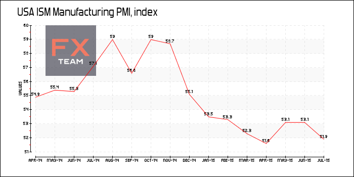 Индекс менеджеров по закупкам в производственной сфере США составил 52,7 пункта за июль 2015 г. по сравнению с 53,5 пункта в июне, сообщает Institute for Supply Management (ISM). Прогнозировалось повышение показателя до 53,6 пункта.