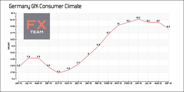 По данным GfK, опережающий индекс потребительского климата Германии составил 9,9 пункта за сентябрь 2015 года по сравнению с предыдущим значением 10,1 пункта. Аналитики прогнозировали повышение показателя до 10,2 пункта.