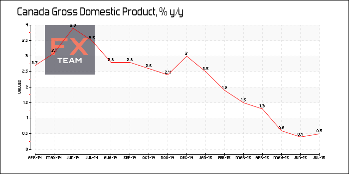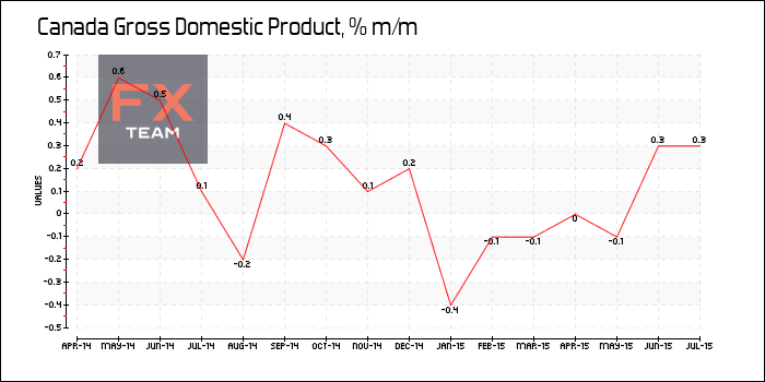 По данным Статистического управления Канады, объем ВВП увеличился на 0,3% за июль 2015 г. в месячном исчислении после роста на 0,4% в июне. Ожидалось повышение показателя на 0,2%.