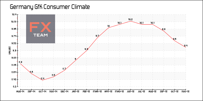 По данным GfK, опережающий индекс потребительского климата Германии составил 9,4 пункта за ноябрь 2015 года по сравнению с 9,6 пункта в предыдущем месяце. Аналитики прогнозировали снижение показателя до 9,5 пункта. Потребительский климат в Германии ухудшается третий месяц подряд.