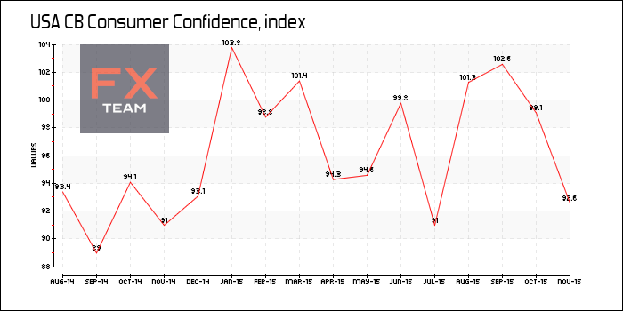Индикатор потребительской уверенности (CBConsumerConfidence) составил 90,4 пункта за ноябрь 2015 г. по сравнению с 99,1 пункта в предыдущем месяце. Аналитики прогнозировали повышение показателя до 99,3 пункта.