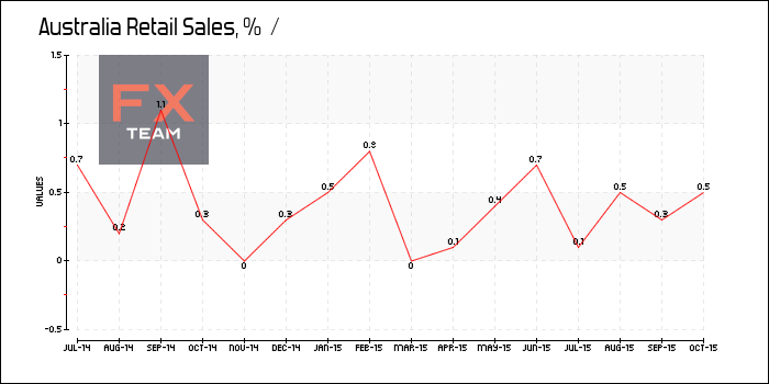 Объем розничной торговли Австралии с учетом сезонных факторов увеличился на 0,5% за октябрь 2015 г. в месячном исчислении, сообщает Управление статистики. Значение показателя превысило прогноз роста на 0,4%. Месяцем ранее индекс повысился на 0,4%.
