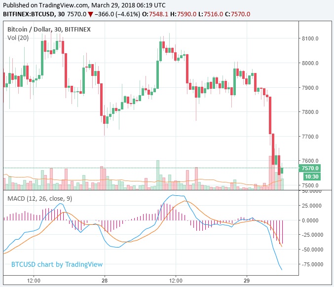 Курс биткоина (BTC) упал ниже $7,600 впервые с 19 марта. В начале дня эталонная криптовалюта просела до $7,530 после достижения $8,150 менее 20 часов назад.
