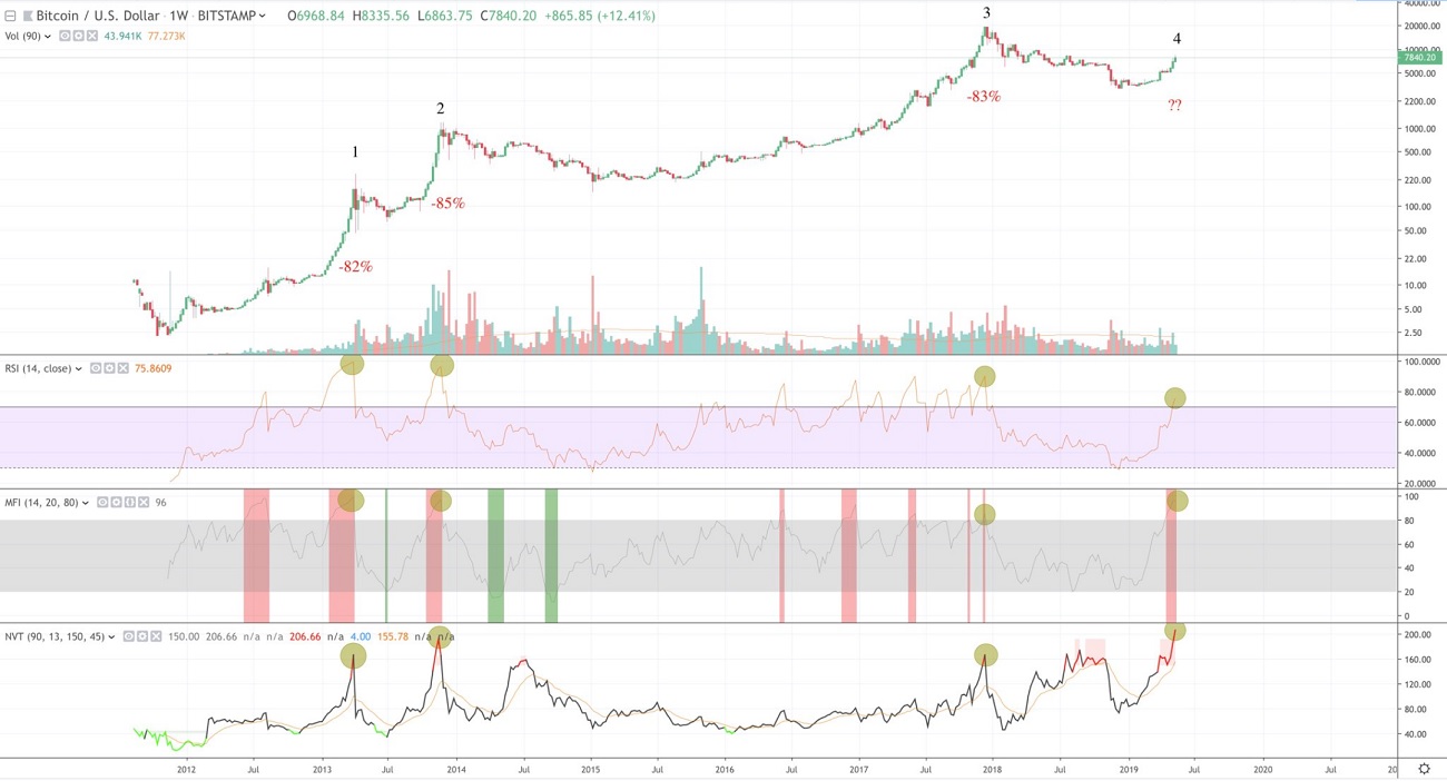 Биткоин (BTC) может находиться на грани нового обвала. Трейдер “HiThrowaway” в своем твите отметил, что последние 3 раза, когда актив на недельных графиках выглядел таким образом, происходили 82%, 85% и 83% коррекции. Если подробнее, то последние разы, когда Индекс относительной силы (RSI), Индекс движения денежной массы (MFI), Соотношение транзакций к стоимости актива (NVT) были на текущих уровнях, BTC обваливался.