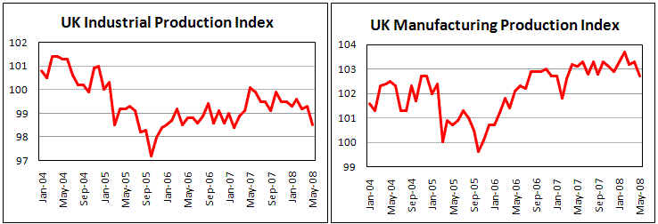 Индекс промышленного производства Великобритании упал в мае на 0,8% до уровня 98,5. За год снижение составило 1,6%. Индекс обрабатывающей промышленности также демонстрирует снижение, как в течение месяца, так и по итогам года. Текущий отчет состояния промышленности идет в соответствие с индексами PMI, опубликованными на прошедшей неделе и указывающими на ускорение темпов замедления экономики Великобритании. Кроме промышленности и строительного сектора, максимальными с 2001 года темпами сокращается активность в сфере услуг. Эти данные в сочетании и инфляцией увеличивают риск того, что ВВП Великобритании во втором квартале сократится. Темпы роста цен на потребительские товары достигли 3,3%, максимального уровня за 11 лет, и по прогнозам монетарного комитета Банка Англии могут превысить 4,0% в этом году, нанося удар по потребительским настроениям. Также Банк Англии прогнозирует дальнейшее падение объемов потребительских кредитов, так как банки, испытывая трудности в финансировании, ужесточают процедуру кредитования. Целая череда негативных макроэкономических показателей ставит экономику Великобритании на грань рецессии, первой за 17 лет.