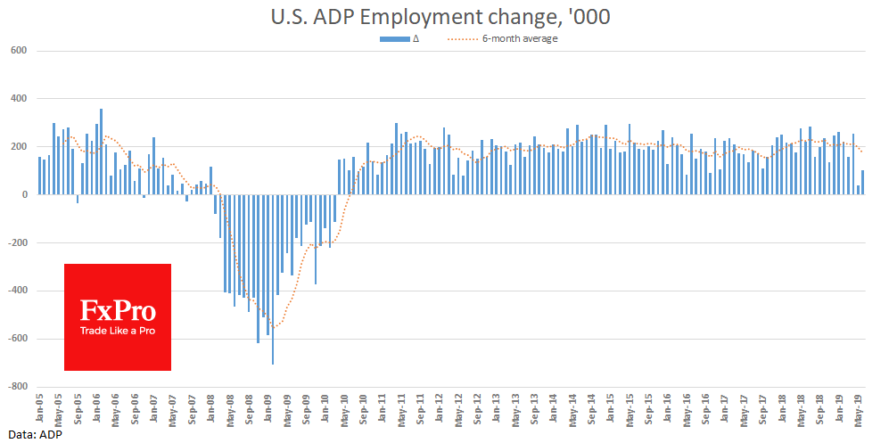 Рынки переключились в режим, который можно коротко охарактеризовать как «чем хуже, тем лучше». В среду индексы обновляли максимумы на фоне довольно слабых макроэкономических данных из Штатов. Дефицит внешней торговли поднялся до самых высоких уровней в этом году, а непроизводственный ISM провалился до самого низкого уровня почти за 2 года. Данные от ADP отметили рост занятости в июне в частном секторе на 102 тыс. после 42 тыс. месяцем ранее. Это значительно слабей ожиданий (140 тыс.) и отражает явную потерю темпов роста занятости в последние месяцы, настраивая на слабый официальный отчет в пятницу.