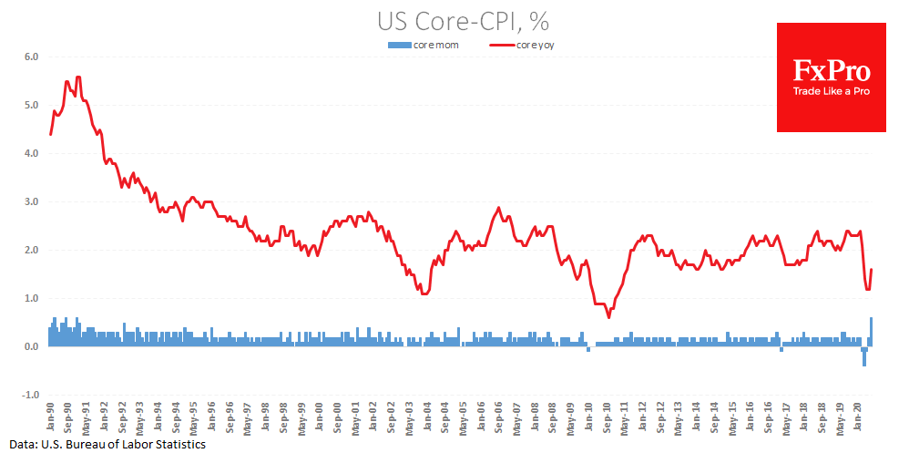 Новая порция данных об усилении инфляции. На этот раз из США, где CPI в июле вырос на 0.6% и снова превысил ожидания. Базовый индекс цен также подскочил на 0.6% за месяц, что в последний раз наблюдалось в 1991 году. Корни роста стоит искать в нарушенных логистических цепочках и программах стимулов в США.