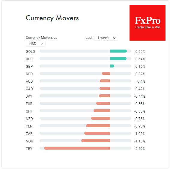 Важным положительным моментом является то, что мы видим переток в доллары и долларовые облигации из других долговых рынков и некоторых валют стран EM. В частности, доллар почти равномерно прибавляет около 0.4% с начала недели как к сырьевым CAD и AUD, так и основным конкурентам – резервным валютам JPY и EUR.
