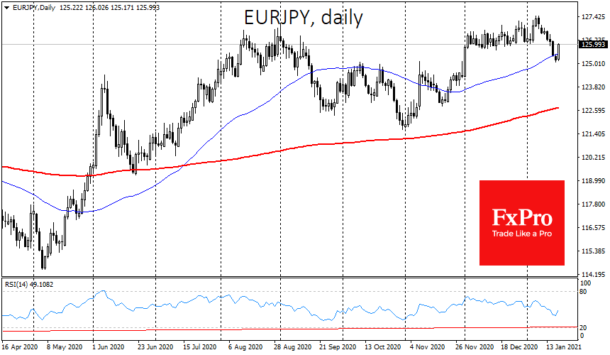 Единая валюта в понедельник успешно выстояла против натиска медведей, оставшись выше 50-дневной средней против доллара и иены. По EURJPY покупки усилились на спаде к 125, вернув сейчас пару к 125.80.