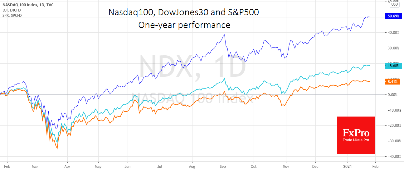 В таких условиях нет ничего удивительного в благосклонности инвесторов к акциям высокотехнологического сектора, который блистал в прошлом году. На контрасте сохраняется некоторое давление на индекс Dow Jones, который потерял 0.1% за вторник, а фьючерсы на него в среду утром теряют еще 0.2%.