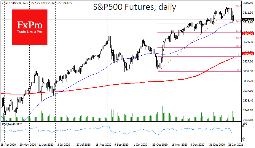 Столь неровная динамика часто наблюдается в конце рыночного цикла. Исход борьбы за 50-дневную среднюю может положить начало большому движению на следующей неделе, потенциально предопределив настроения на весь февраль. Свою борьбу за 50-дневные средние ведут также DowJones и DAX30. Повышенная волатильность акций в последние дни резко повышает шансы более глубокой коррекции, поскольку часто является приметой истощения предыдущего тренда.