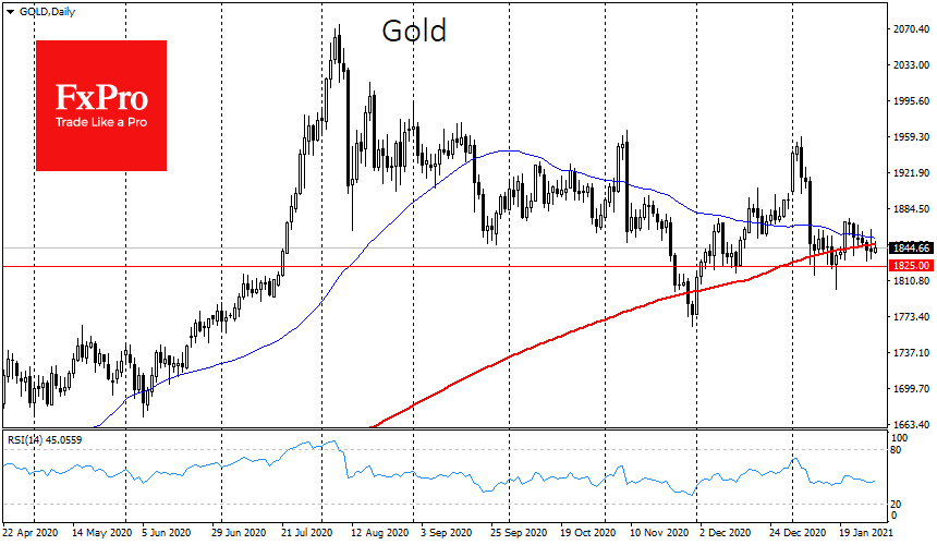 Техническая картина для Gold остается весьма тревожной: цена опустилась ниже 50- и 200-дневной средних, а внутридневной рывок выше этих линий и промежуточного круглого уровня $1850 не был устойчивым. Такая динамика заставляет рассматривать поддержку на $1825 как возможную последнюю линию обороны, провал под которую может резко усилить снижение котировок.