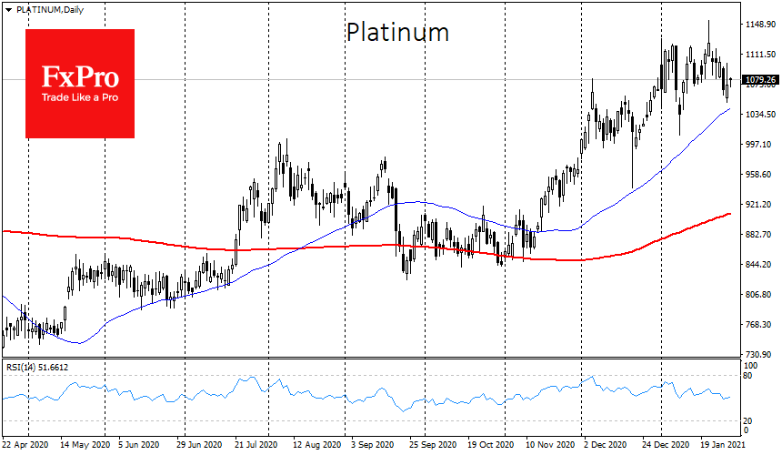 Платина в четверг подскакивала на 5%, но так и не сумела зацепиться за уровни выше $1100. Ее котировки под давлением последнюю неделю после 33%-ого ралли в область 5-летних максимумов на $1150 с ноября. Потенциально важными целями быков выглядят уровни вблизи $1200 и далее – на $1400, где в прошлые годы часто происходили развороты и консолидации.