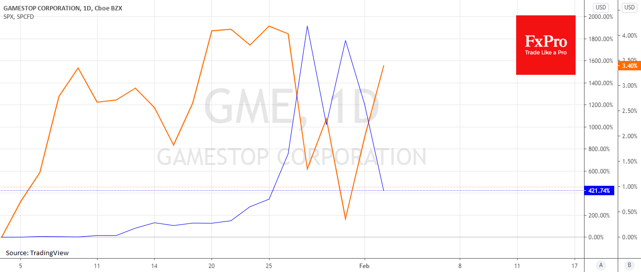 Глобальные рынки акций на этой неделе получают мощный импульс роста, в то время как активы сообщества Wall Street Bets теряют в цене. Американские индексы во вторник вернулись к максимумам недельной давности, а вот стоимость акций GameStop опустилась на двухнедельные минимумы. Напомним, что на прошлой неделе была ровно противоположная картина.