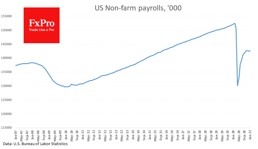 Спад предыдущего месяца пересмотрен с понижением с -140 тыс. до -227 тыс. Число рабочих мест в экономике США курсирует вокруг 142.6 млн. с октября. Восстановление рынка труда забуксовало.