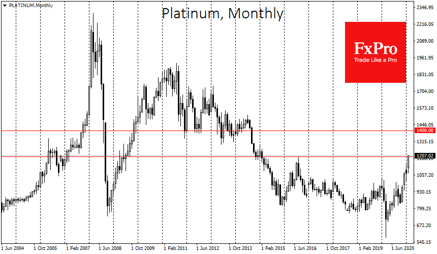 Сегодня утром цена на унцию платины обновила 6-летний максимум, превысив $1206. Далее открывается уже прямая дорога в область $1400, где платина курсировала с 2011 по 2014 годы. Рост цен на нее обусловлен не столько инфляционными ожиданиями, сколько ставкой инвесторов на повышенный промышленный спрос этого металла для производства компонентов электромобилей.