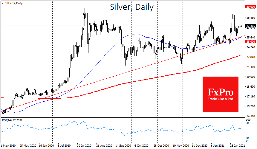 Позитивный взгляд на перспективы золота поддерживается динамикой других драгоценных металлов. Серебро и платина по очереди привлекают внимание резкими скачками и обновлением максимумов.
