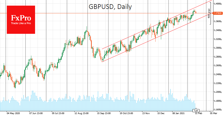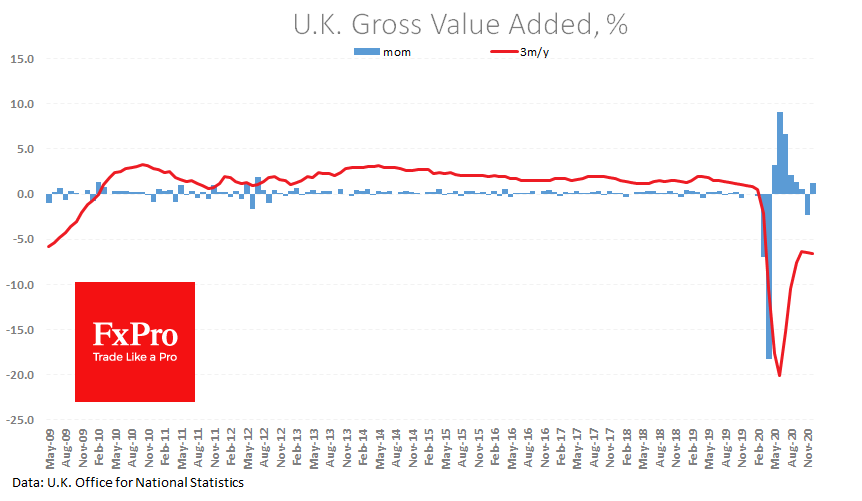 Опубликованные утром данные по ВВП Великобритании существенно превысили ожидания, но это слабо помогает фунту в моменте. По итогам четвертого квартала ВВП прибавил 1%, вдвое сильней ожиданий. Падение за весь 2020 на 9.9% – худшее в истории – и не позволяет фунту праздновать на фоне настороженного хода торгов на мировых рынках.