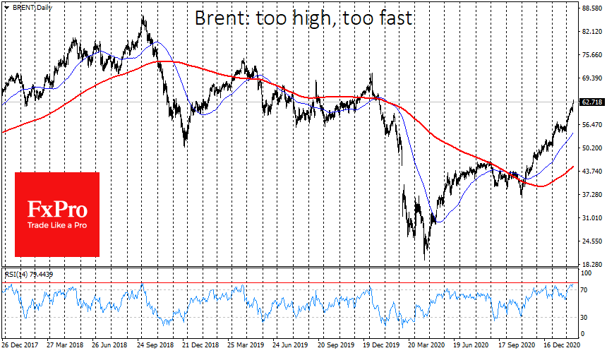 Котировки Brent превысили отметку $63 в начале торгов в понедельник, доведя прирост с начала месяца до 15%. Задали этот импульс геополитические трения на Ближнем Востоке.