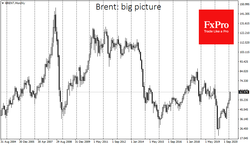 Сейчас Brent стоит примерно столько же, как в конце января 2020, когда сообщения о коронавирусе в Китае начали оказывать видимое влияние на рынок. Таким образом, уровень цены уже полностью восстановился. В то же время, объемы добычи примерно на 10% ниже, чем год назад, так как между бурением и извлечением обычно проходит 4-9 месяцев.
