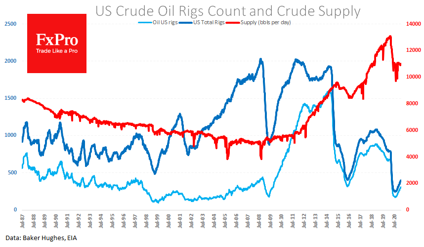Эти же риски представляет собой все усиливающееся давление России, которая уже при подходе Brent к $50 начала продвигать идею нормализации объемов добычи. Американские сланцевики уже давно перешли от ожиданий к делу, нарастив на прошлой неделе число нефтедобывающих буровых на 78% с августа.
