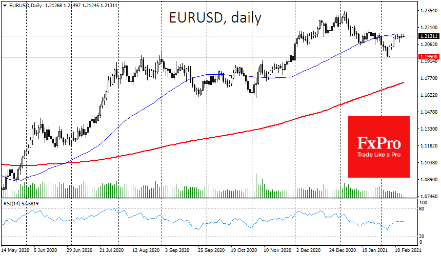 Пара EURUSD при этом уперлась в сопротивление в виде 50-дневной средней у 1.2150 за счет охлаждения темпов восстановления экономики.