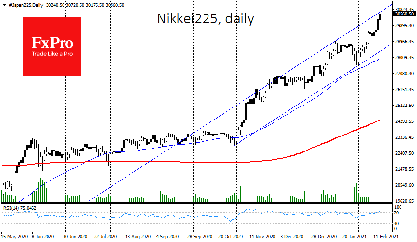Индекс Nikkei225 продвигается все дальше в область 31-летних максимумов, забираясь выше уровня 30 000. Однако это происходит на все более снижающихся объемах. Это может оказаться как сигналом неуверенности покупателей, так и банальным снижением торгов из-за празднования лунного нового года. Как бы то ни было, при подобной динамике рынка более надежной является стратегия продаж на росте.