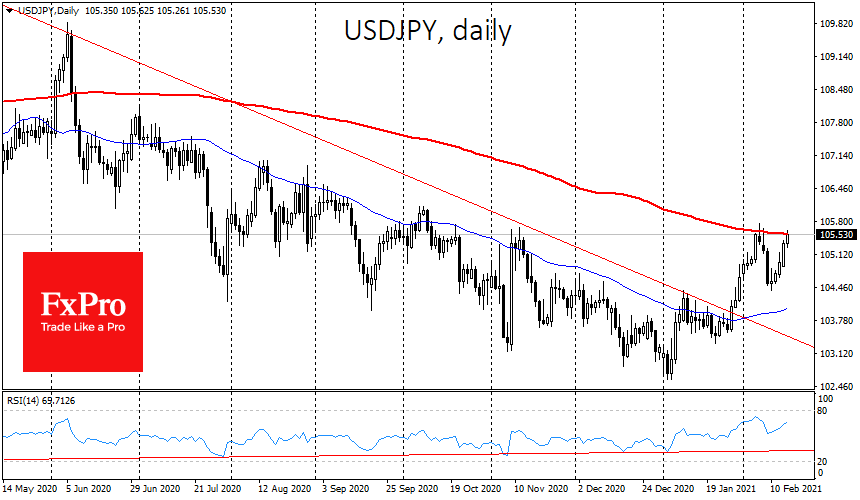 USDJPY на прошлой неделе откатилась при попытках роста выше 200-дневной средней. Сегодня она вновь тестирует эту линию, поднявшись до 105.50. Очередной откат обещает стать сигналом к тому, что крупный капитал так и не переключился с коронавирусного трейда на восстановительный.