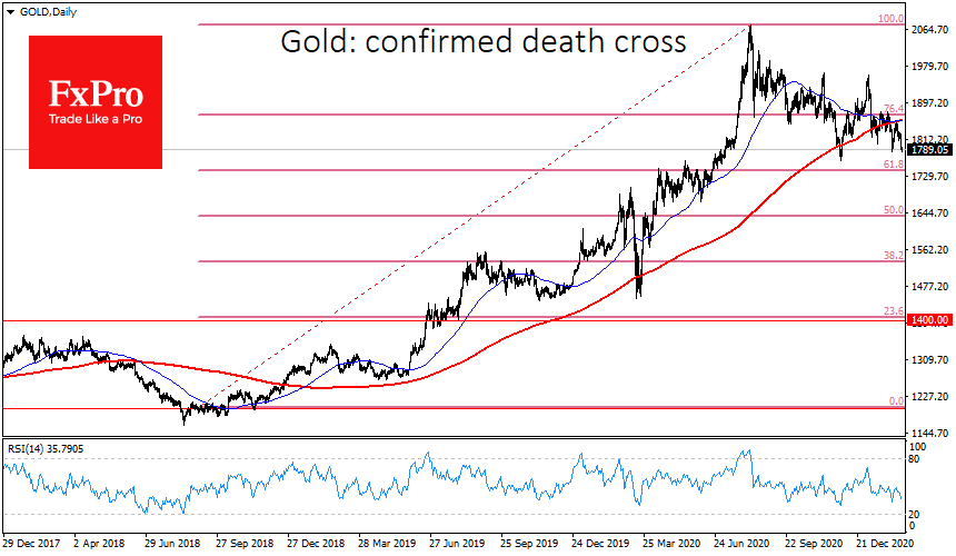 Золото сдает позиции пятую торговую сессию подряд после неудачной попытки вернуться выше уровней 50- и 200-дневных средних. То есть мы наблюдали очевидный слом попытки возвращения в тренд роста.