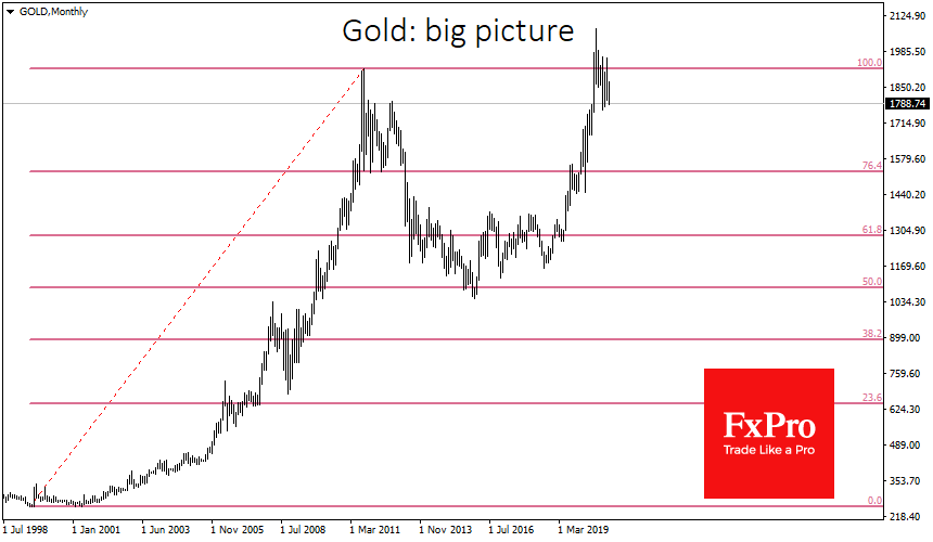 Нынешняя волна роста золота стартовала в августе-сентябре 2018 года от уровней вблизи $1200 до $2075, которых удалось достичь в августе 2020 года. Ближайшей целью дальнейших продаж выглядит уровень $1734, коррекция на 61.8% от предыдущей волны роста по Фибоначчи.