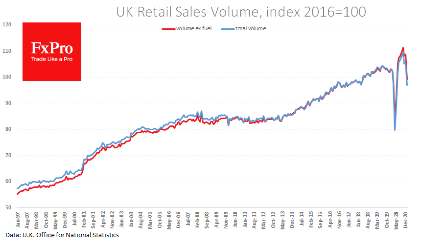 Розничные продажи в Великобритании рухнули на 8.2% за январь, что существенно слабей ожидавшегося сокращения на 3% и оказались на 5.9% ниже уровня годом ранее. Провал продаж за вычетом расходов на топливо оказался еще сильней – 8.8%.