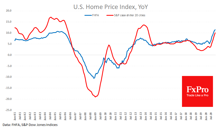 Свежие данные от FHFA отметили рост цен на жилье в декабре на 1.1%, и это седьмой подряд месяц роста цен более чем по 1%. Согласно данной метрике, цены сейчас на 11.4% выше, чем годом ранее.