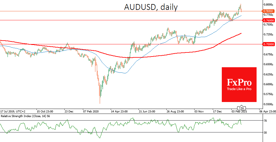 Сырьевые валюты развитых стран не сумели закрепиться выше значимых круглых уровней против доллара: AUDUSD отброшена до 0.7820 после ухода выше 0.8000, а USDCAD торгуется у 1.2620 после обновления 3-летних минимумов у 1.2470.