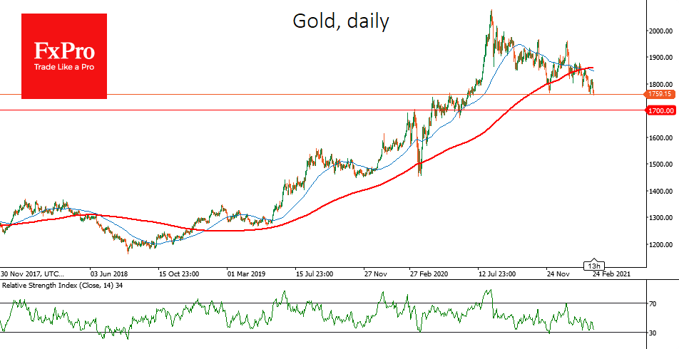 Для золота следующим важным уровнем является $1700. Провал под него станет полной капитуляцией быков, которые толкали цену вверх два года подряд, по август 2020-го.
