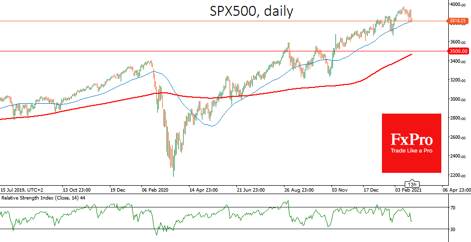 S&P500 торгуется у отметки 3800, вблизи которой проходит 50-дневная средняя. Закрепление заметно ниже этого уровня, как и год назад способно вызвать еще большее усиление волатильности и расширить масштаб распродажи активов на весь спектр рынка. Первой целью коррекции тогда может стать область 3500, вблизи которой проходит 200-дневная средняя.