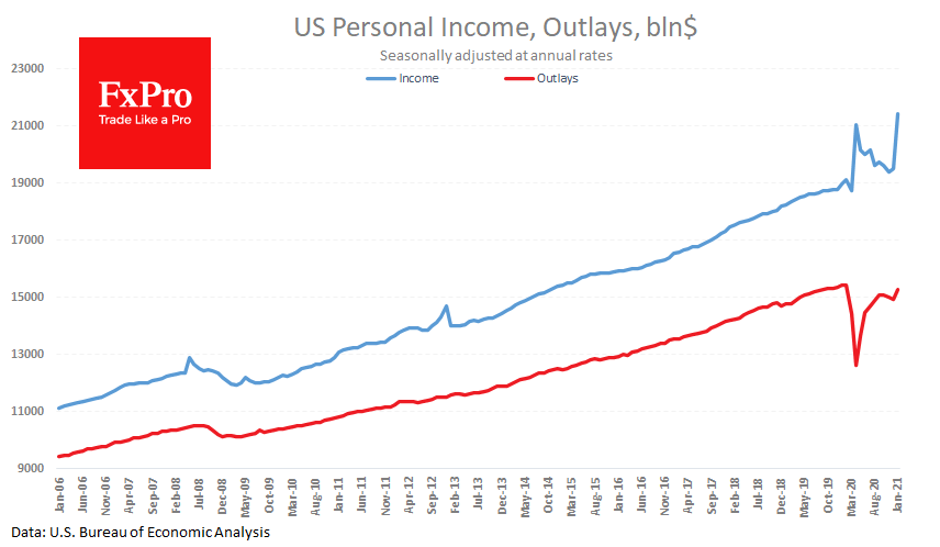 Помесячные данные личного потребления американцев отметили 10% скачок доходов в январе за счет $600 чеков и продления программы повышенных выплат по безработице. Это лучше ожидавшихся 9.4% и меньше апрельского скачка на 12.2%, когда выписывались более внушительные чеки.