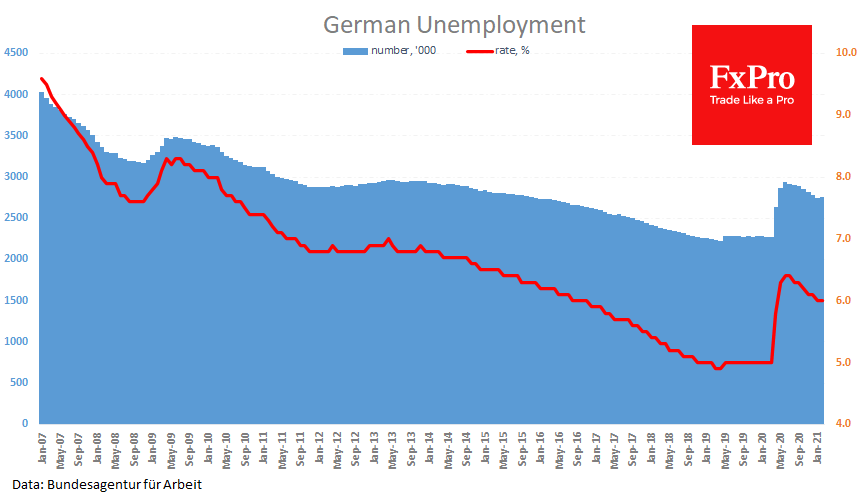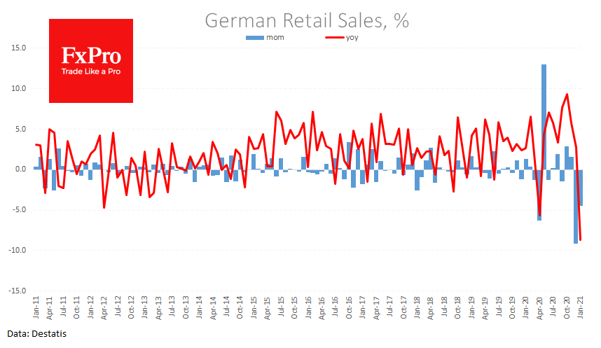 Хуже того, данные из Европы сегодня также настраивают на минорный лад. Розничные продажи по Германии рухнули на 4.5% в январе после обвала на 9.1% месяцем ранее. Этот двухмесячный спад на треть больше, чем во время первой волны пандемии в марте-апреле 2020. К данным прошлого года продажи рухнули на 8.7%.