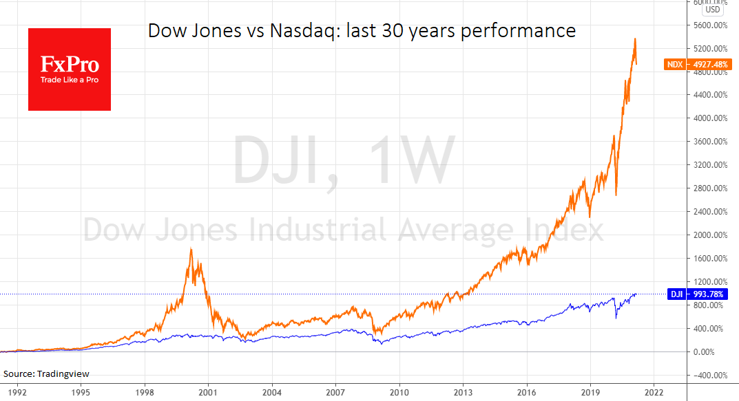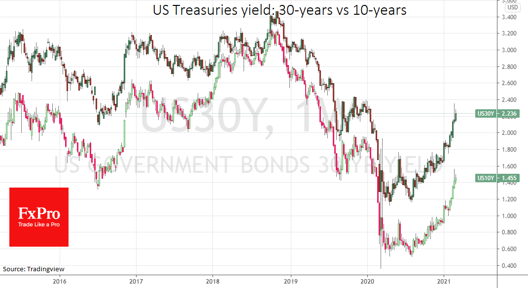 Компании роста, доминирующие в индексе Nasdaq, теряют привлекательность на фоне продолжающегося повышения доходностей долгосрочных облигаций. Доходности 10-летних Treasuries вновь достигали до 1.5%, а у 30-летних бумаг – до 2.28%, что близко к пикам прошлой недели у 2.35%. Этот рост не только усиливает контраст с дивидендами, но и потенциально ужесточает условия фондирования для рынков.