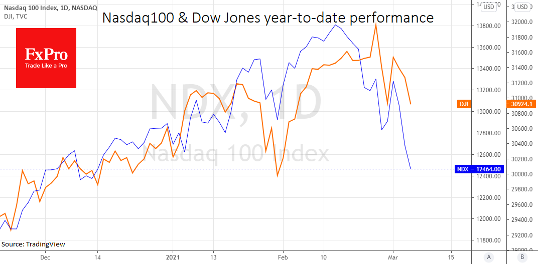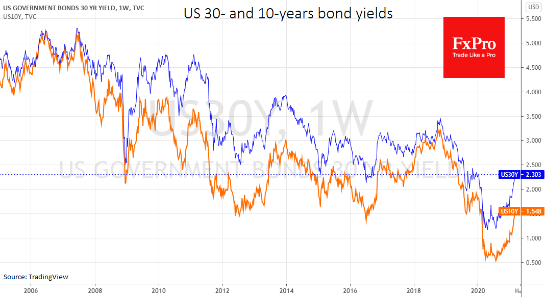 Вчера был очередной день падения Nasdaq более чем на 2%. Потери Dow Jones были намного более скромные, -1.1%, равно как и S&P500, который снизился на -1.3%. Произошло это на фоне продолжающегося роста доходностей американских долгосрочных гособлигаций. Доходность 10-леток поднялась до 1.57% - новых максимумов за 12 месяцев, а по 30-леткам составляет 2.32%, вблизи пиков с начала 2020.