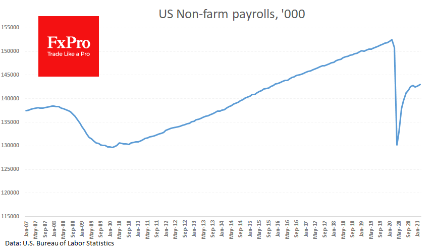 Со стороны макроэкономики – сегодняшний отчёт однозначно очень сильный и важный. Он способен восстановить веру в восстановление экономики. Этот отчет вряд ли остановит повышение доходностей долгосрочных облигаций, так как усилит спекуляции вокруг роста инфляции, но при этом может перестать вызывать распродажу в рисковых активах, включая акции, сырье и металлы. Повышение спроса на риски может сдержать ралли доллара, ставшее особенно обширным последнюю неделю.