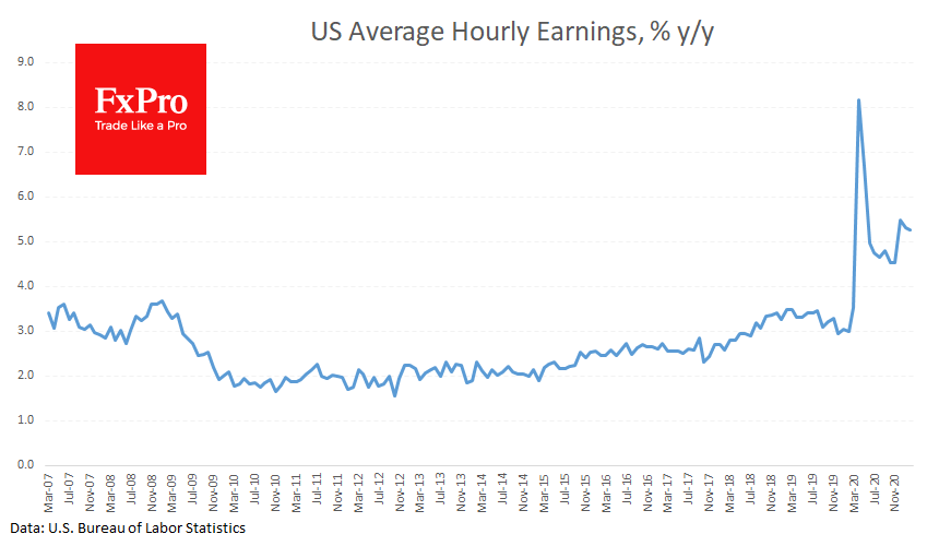 При этом продолжается рост зарплат, что также является позитивным фактором, ведь вместе с расширением занятости, темпы роста зарплат могли поколебаться из-за найма менее квалифицированных кадров, уволенных в начале пандемии, что объясняло скачок зарплат в период локдауна.