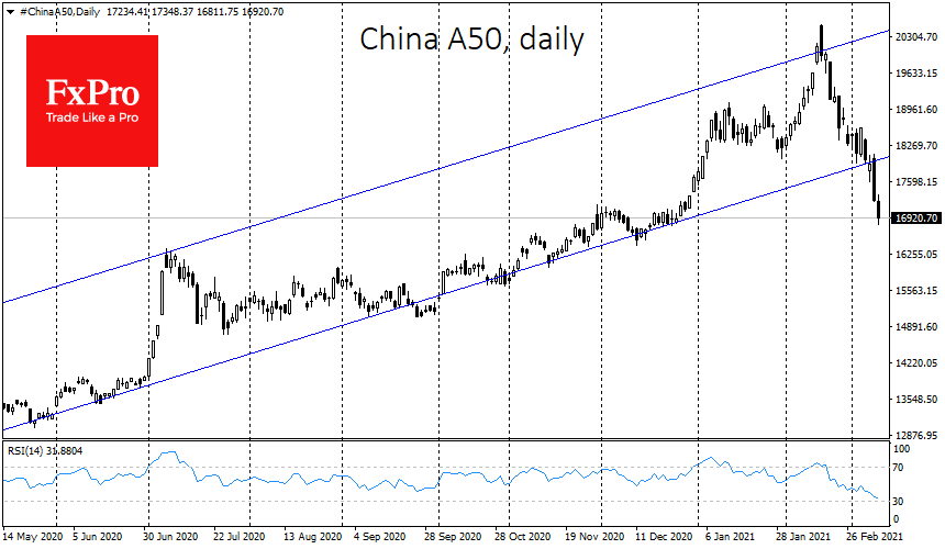 Китайский индекс голубых фишек China A50 теряет сегодня 2%, снизившись от пика на 17.6%.