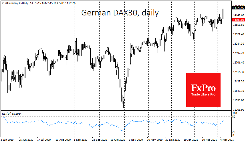 За пределами Америки проявляются аналогичные тенденции. Германский DАХ30 взлетел вчера сразу на 2%, совершив важный прорыв области сопротивления выше 14000, что ему не удавалось сделать с января. Сегодня утром индекс еще раз переписал исторические максимумы.