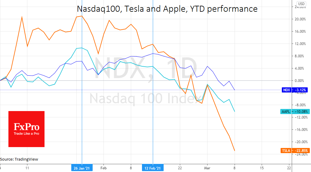 Индекс Nasdaq, в составе которого преимущественно компании сектора высоких технологий, завершил вчера торги на 11% ниже максимального закрытия 12 февраля. Такое падение считается выходом индекса на территорию коррекции. Во вторник утром фьючерсы на Nasdaq демонстрировали малообещающие попытки развить отскок, оставаясь вблизи минимумов за три месяца.