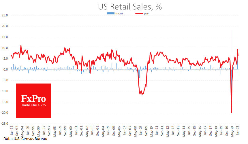 Розничные продажи в США сократились на 3.0% за февраль после роста на 7.6% (пересмотрено с 5.3%) месяцем ранее. К тому же месяцу годом ранее прирост объема продаж составляет 6.5%, замедлившись с 9.3% месяцем ранее.