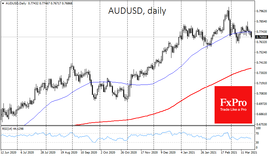 В связи с этим ощущается давление на чувствительные к риску валюты. Так, австралийский и новозеландский доллары теряют 0.7% и 1.2% к доллару США соответственно. Одновременно японская иена укрепляется к большинству конкурентов, вернувшись ниже 109 за доллар и 130 за евро.